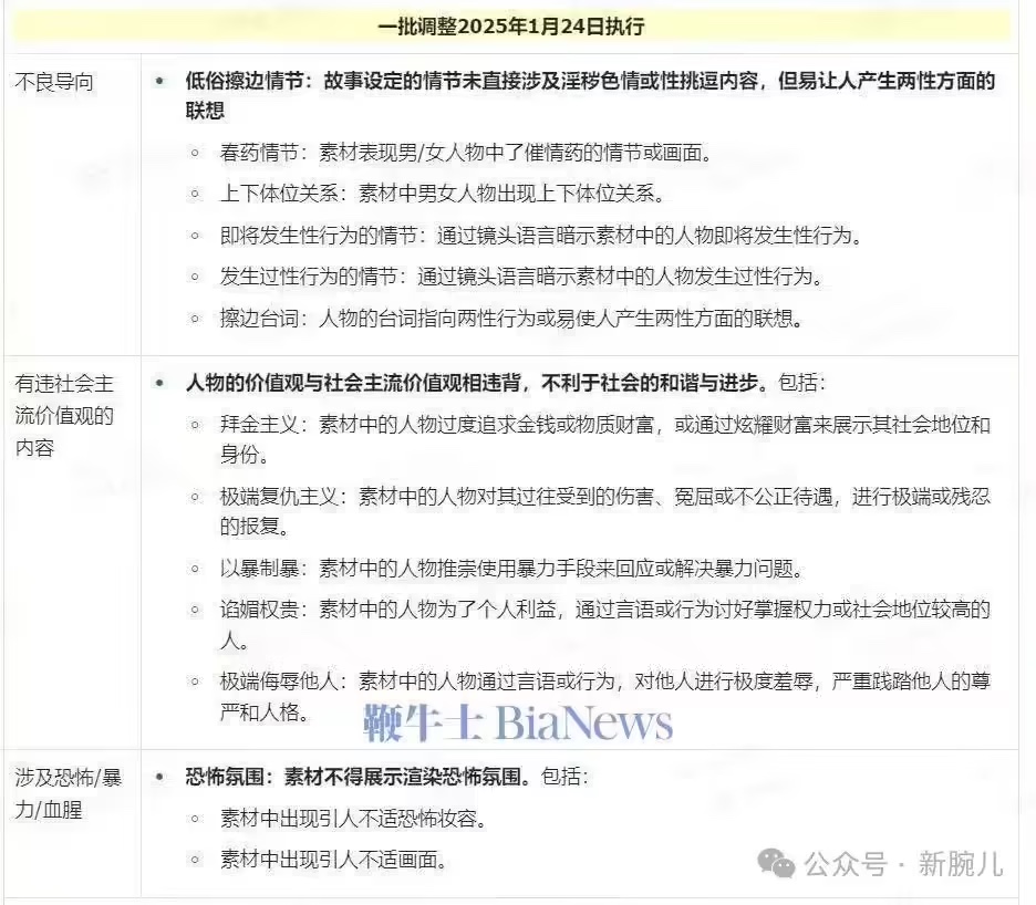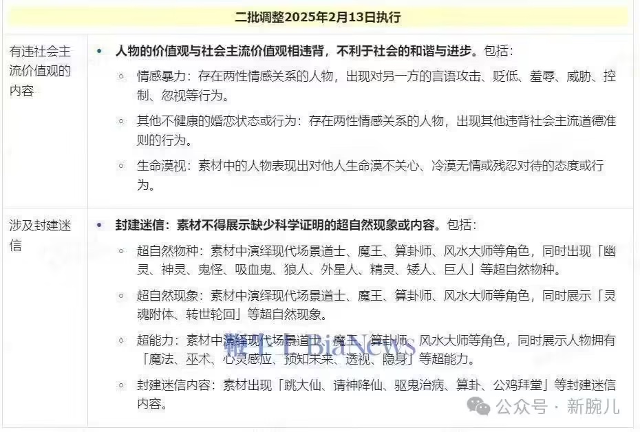 文本显现,1 月 24 日将进行第一批调整,首要包含不良导向体裁、有违社会干流价值观的内容、触及恐惧 / 暴力 / 血腥等体裁。2 月 13 日将履行第二批调整,首要触及有违社会干流价值观的内容以及触及封建迷信的内容。