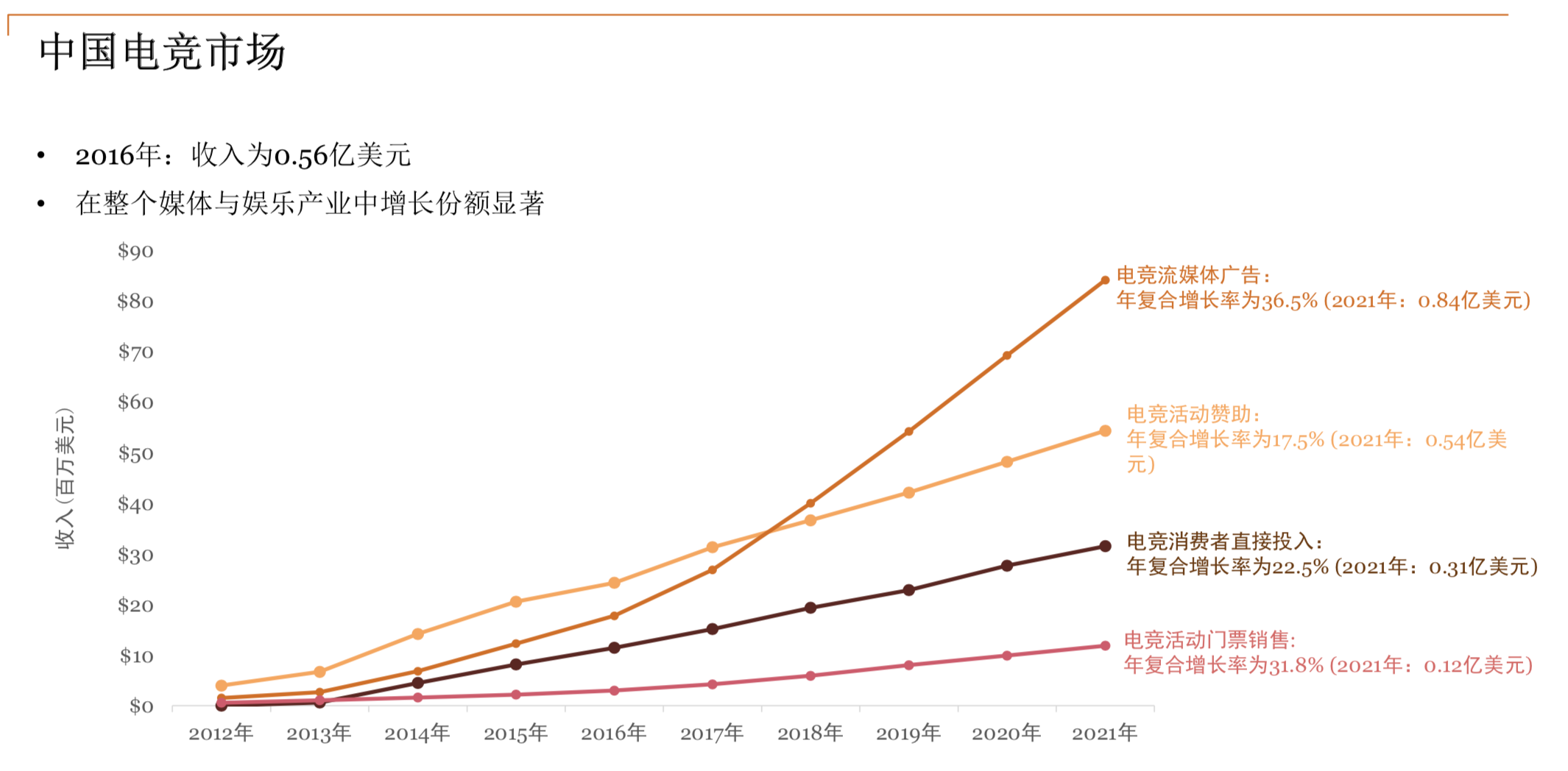 早前的一份趋势陈述显现,我国和亚太地区正在成为游戏电竞的最大消费商场,且将坚持年复合增加率(13.9%)稳步向前,至 2021 年职业收入可达 1.95 亿美元。纵览我国电竞商场的价值推进力,普华永道猜测,到 2021 年,经过流媒体投进的广告价值将达 8400 万美元,来自活动资助的收入将达 5400 万美元,来自粉丝的直接付费将达 3100 万美元,全体来看,我国电竞职业的上升趋势与蓬勃开展的视频游戏商场相关。2016 年我国视频游戏全体营收为 154 亿美元,而到 2021 年,将与当时最大的商场美国比肩,到时职业营收猜测将达 262 亿美元。这其间,游戏直播带来的经济效益必定不容小觑。