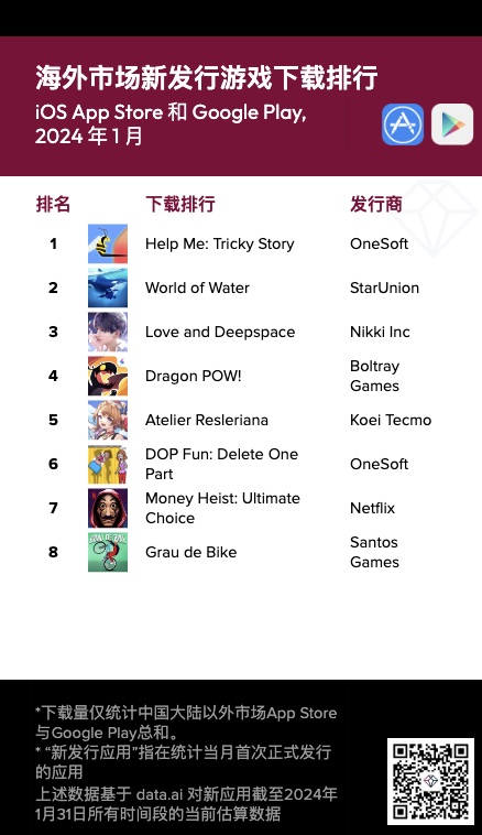 依据 data.ai 发布的 2024 年 1 月海外新使用下载榜,本期共有 8 款新游戏使用,4 款新非游戏使用下载量打破 100 万。榜单榜首名别离是超休闲益智游戏 Help Me: Tricky Story,以及个性化东西类使用 ShowMe。